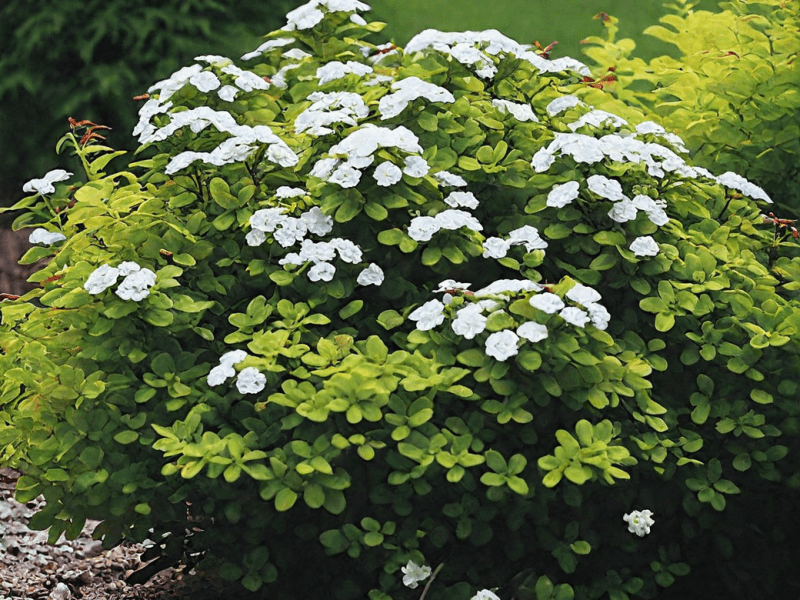 Надежный, обильноцветущий сорт с очень плотной, шаровидной формой кроны. Ценится за дружное и пышное цветение: в июне куст практически полностью покрывается белыми щитковидными соцветиями. Листья напоминают березовые, при распускании имеют бронзовый оттенок, летом становятся темно-зелеными, а осенью окрашиваются в насыщенные желтые, оранжевые и багряные тона. Высота куста — до 0,6–0,8 м. Отличается высокой зимостойкостью и устойчивостью к болезням. Прекрасно подходит для бордюров, каменистых садов и создания низких, плотных групп.